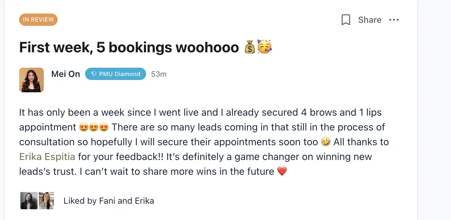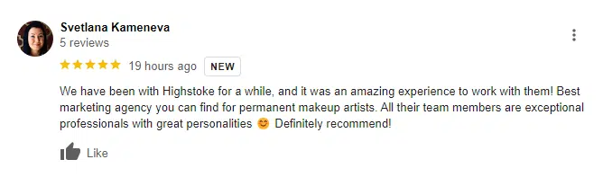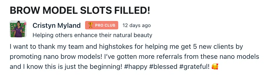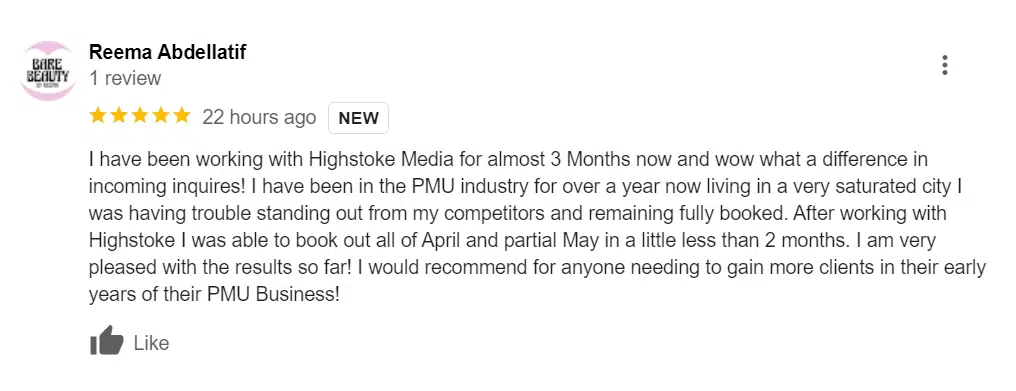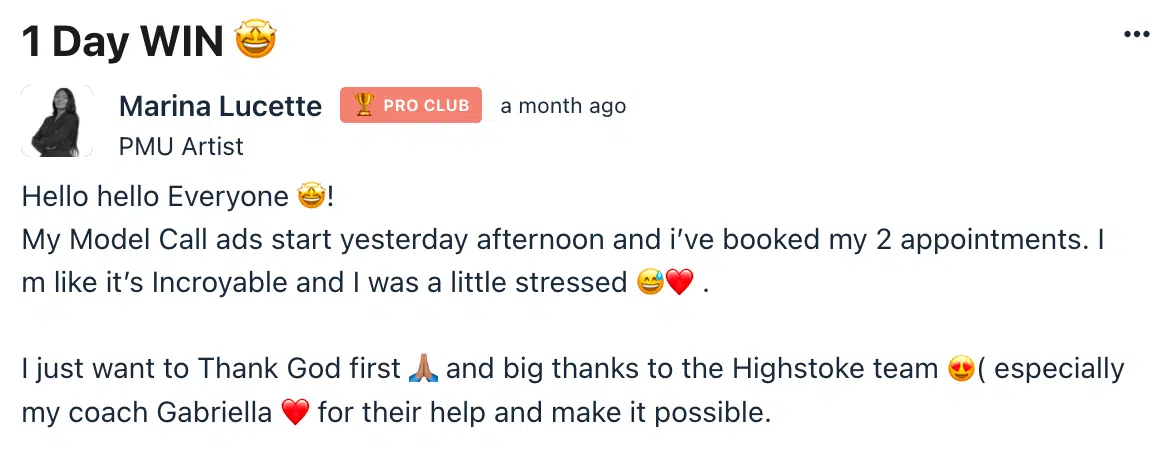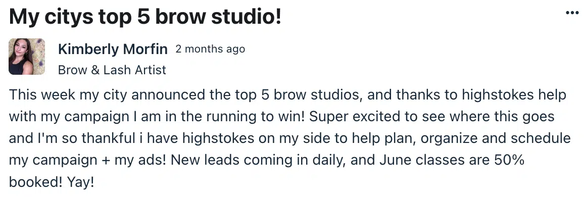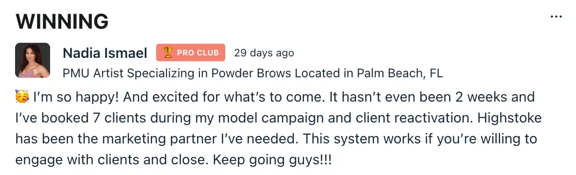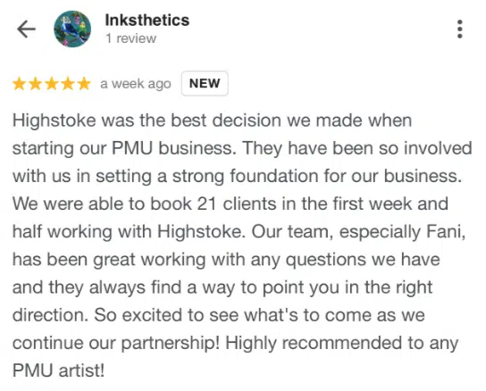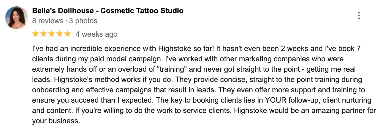 "In just a week with Highstoke, I've booked four appointments, one consultation, and a permanent makeup class, totaling $3,700."