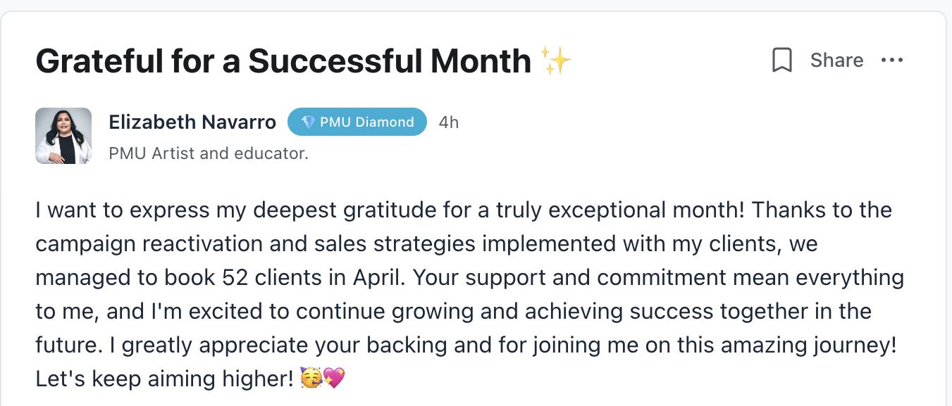 “I found a supportive community of PMU artists who help me with social media, marketing, and client communication. If you're struggling, join them"
