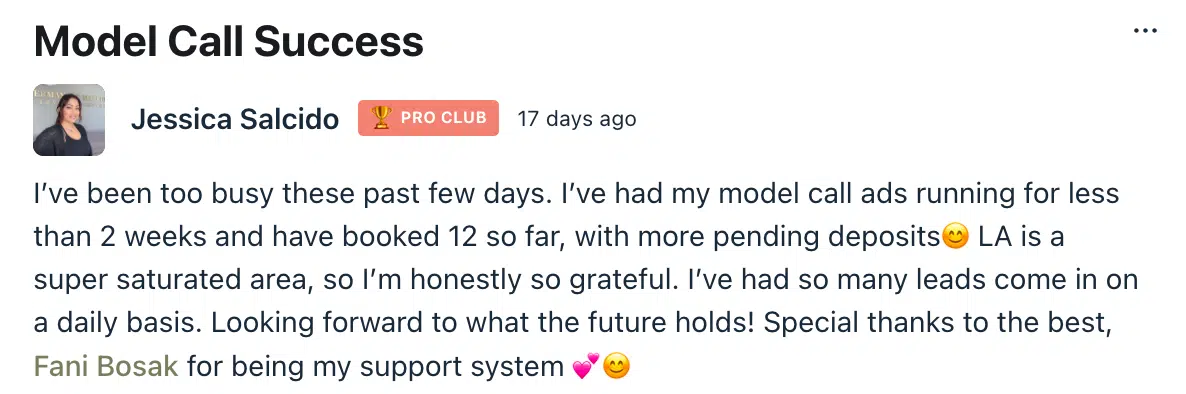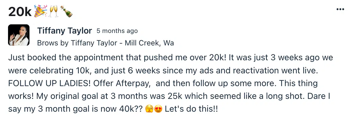 Within the first week of launching her ads and reactivation campaign, Suzie saw an influx of bookings for January and February and received training inquiries that led to booking 3 students immediately.